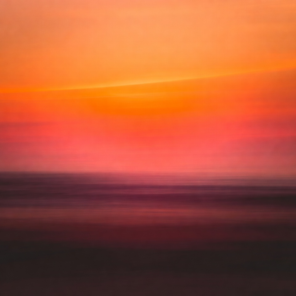 A stunning sunset sky features a gradient of warm colors from deep orange at the top to pink and purple at the bottom. The horizon blends into darker shades of magenta and black. Smooth horizontal layers create a blurred, ethereal effect.