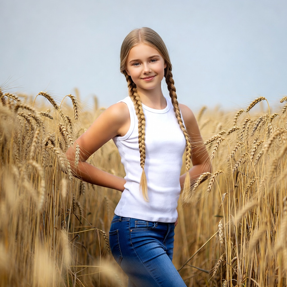 White, agriculture, blonde hair, blue jeans, female, field, golden wheat, hands on hips, outdoor, pigtail braids, smiling, standing, summer, wheat field, white tank top, young girl, girl