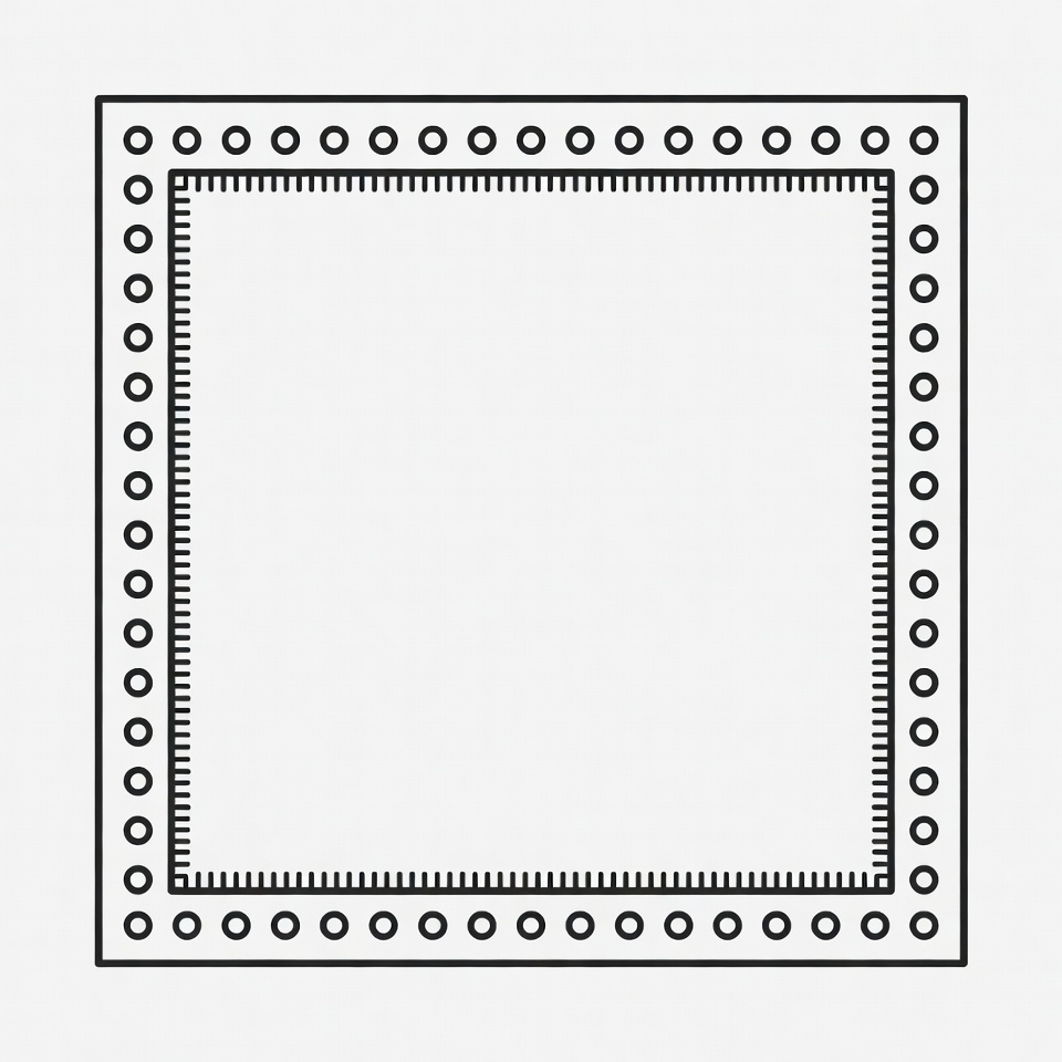 A simple black line drawing of a square frame with evenly spaced dots along the outer and inner edges. The interior is completely empty white space. It is isolated on a white background.