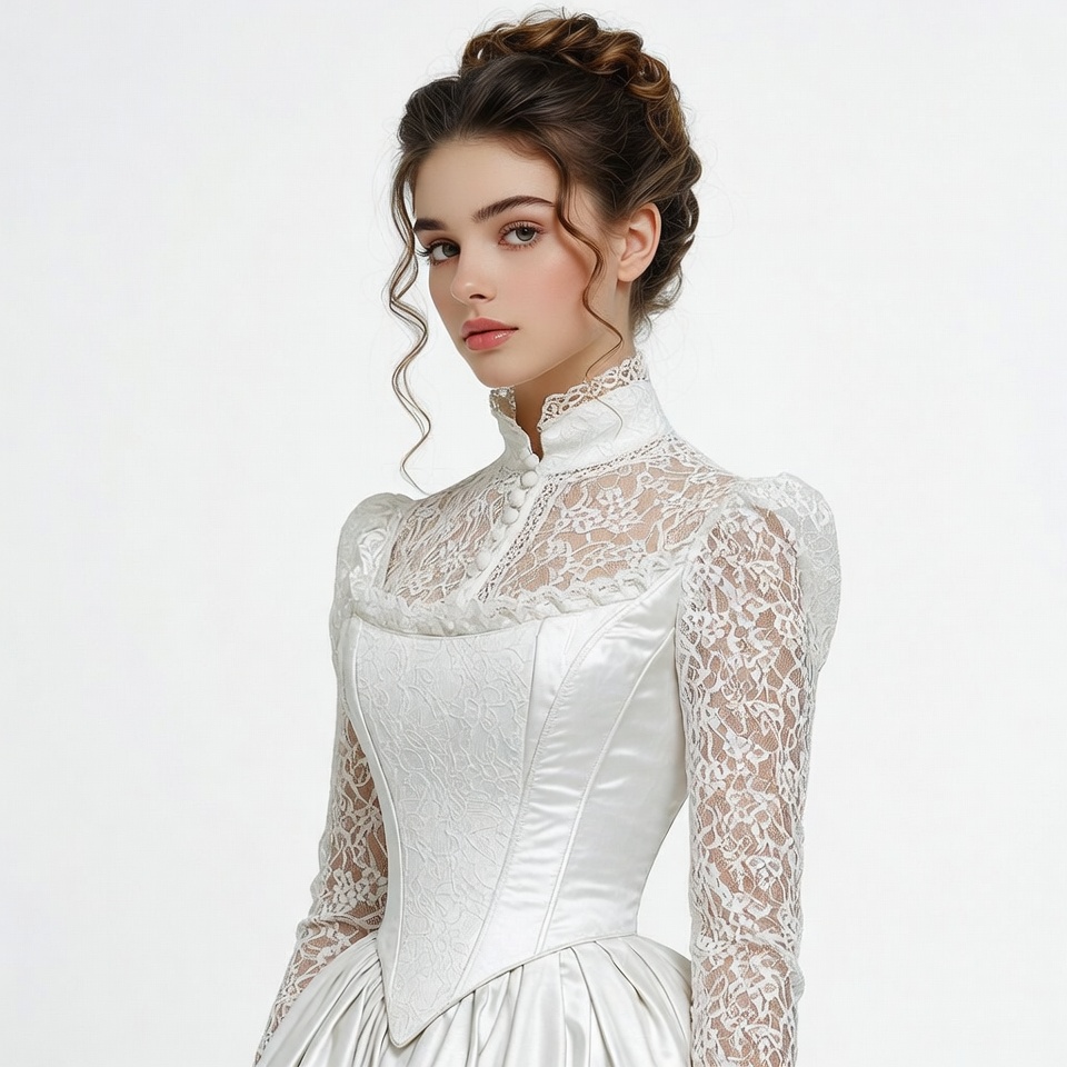 A young woman with dark curly hair styled in an elegant updo stands against a white background. She wears a white Victorian-era dress featuring a high lace collar, puffed sleeves, intricate lace details, and a fitted bodice with a full skirt. Her expression is serene with subtle makeup accentuating her features.