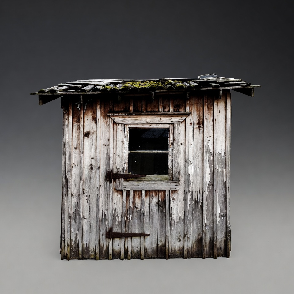 A small, dilapidated wooden shed stands isolated against a dark background. Its weathered gray planks are covered in moss, with a slanted roof featuring broken tiles and green moss patches. A single small window and a rustic door with a latch are visible on the front.