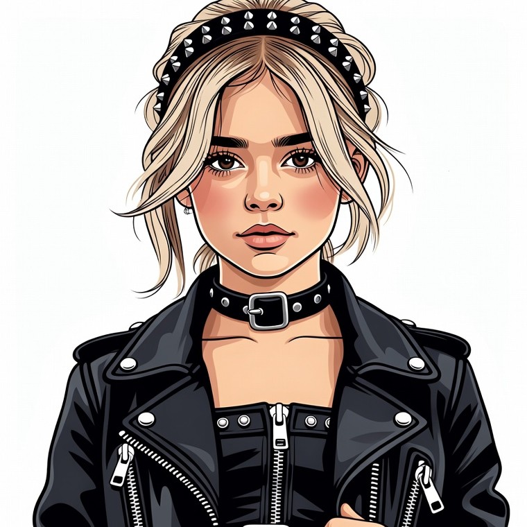 White, accessories, black clothing, blonde hair, choker necklace, closeup, confident expression, digital art, edgy fashion, fashion illustration, female, illustration, isolated background, leather jacket, portrait, punk style, rocker look, silver studs, studded headband, stylish woman, updo hairstyle, vector art, young woman, woman