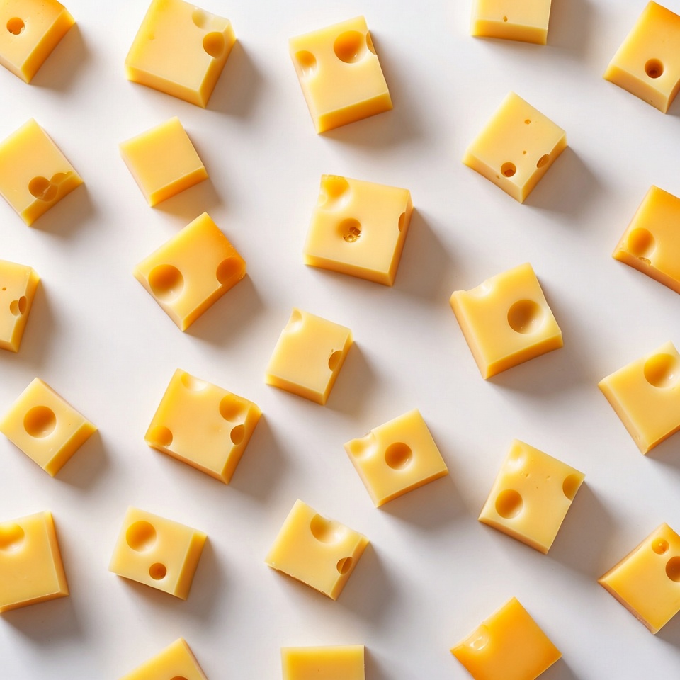 Swiss cheese, appetizing, blocks, cheddar cubes, cheese cubes, dairy, flat lay, food, fresh, gourmet, holes, ingredient, isolated, pattern, scattered, snack, texture, top view, white background, yellow cheese, cheese