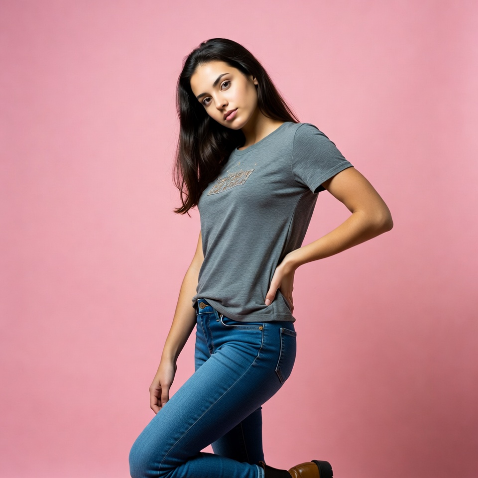 A young Latina woman with long dark hair stands in a side pose against a pink background. She wears a gray t-shirt, blue skinny jeans, and brown boots, with one hand on her hip. Her expression is confident as she tilts her head slightly.