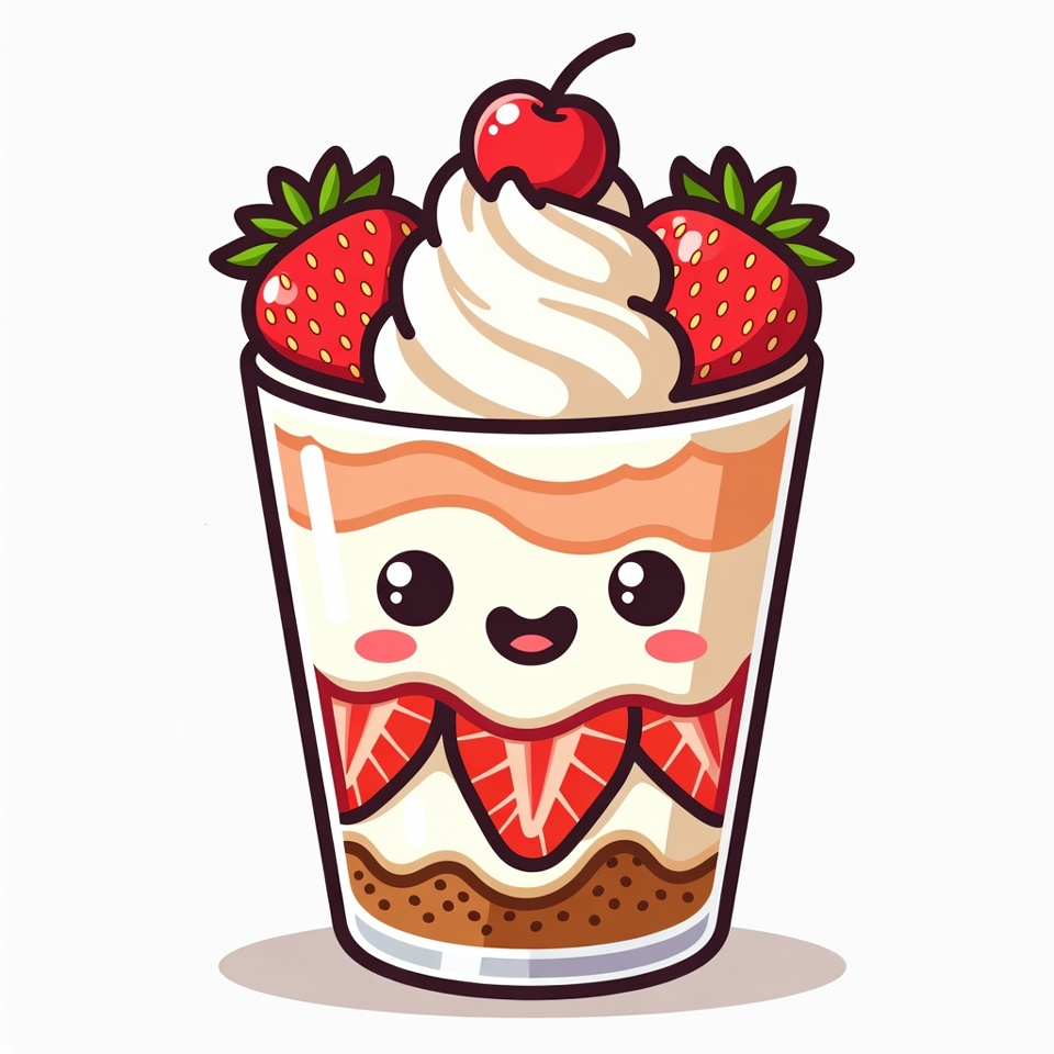 A kawaii-style illustration of a parfait in a glass cup features layers of cream, cake, and strawberries topped with whipped cream and a cherry. The parfait has big sparkling eyes, a smiling mouth, and rosy cheeks for an adorable cartoon look. It sits on a white isolated background.