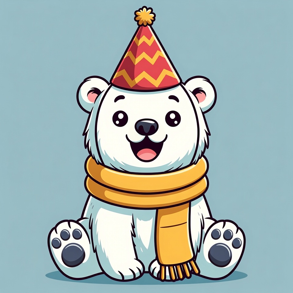 A cute cartoon polar bear sits with a big smile, wearing a red zigzag party hat and a yellow scarf. It has large sparkling eyes and fluffy white fur. The illustration is on a light blue background.