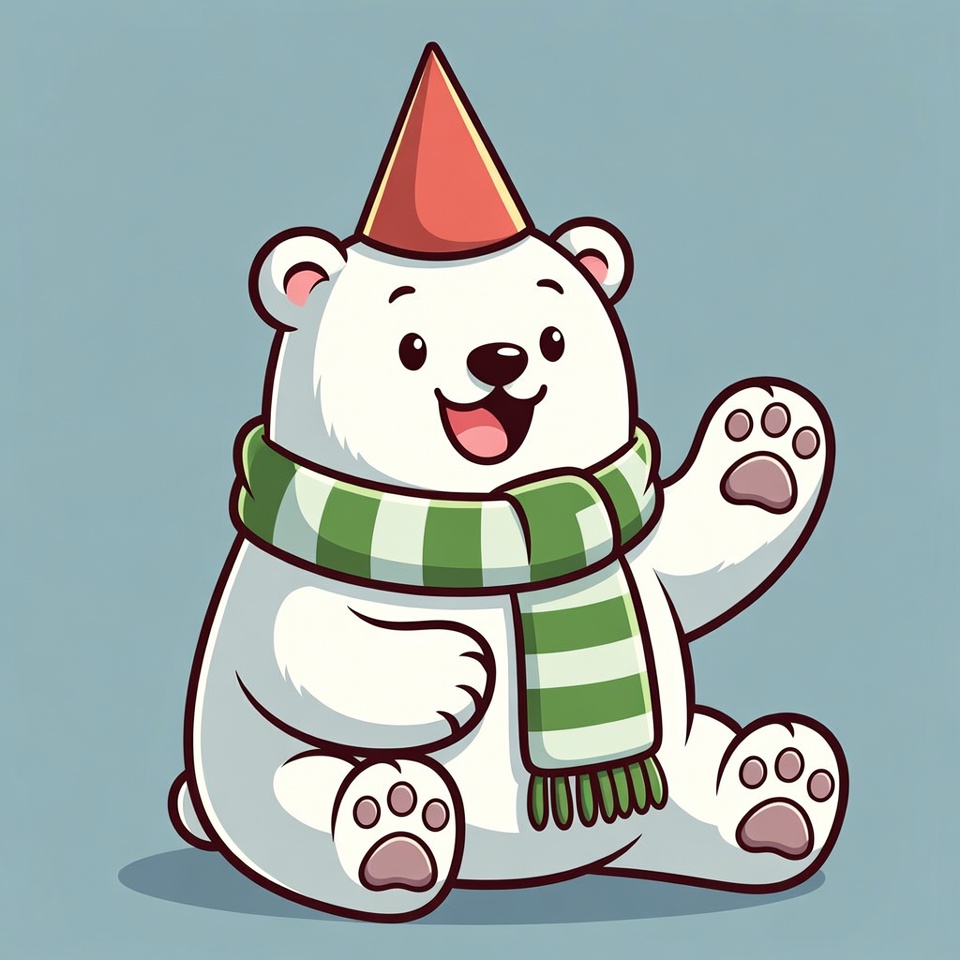 A cute cartoon polar bear sits on a light blue background, wearing a red conical party hat and a green striped scarf. It waves happily with one paw raised, showing a big smile and white fur. The illustration features black eyes, nose, and paw pads in a chibi style.