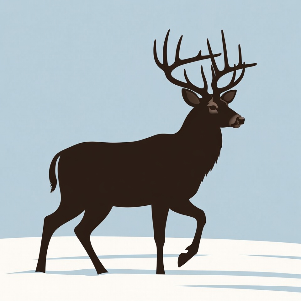 A black silhouette illustration of a deer with large antlers stands on a snowy ground. The deer is depicted in profile view, walking with one front leg raised. It is set against a light blue sky background.