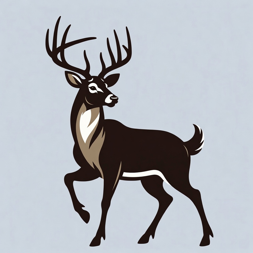 A stylized illustration of a buck deer with large branching antlers stands on a light blue background. The deer has a brown body with white underbelly and tail, and one front leg raised in a dynamic pose. The design features clean black outlines and simple shading.