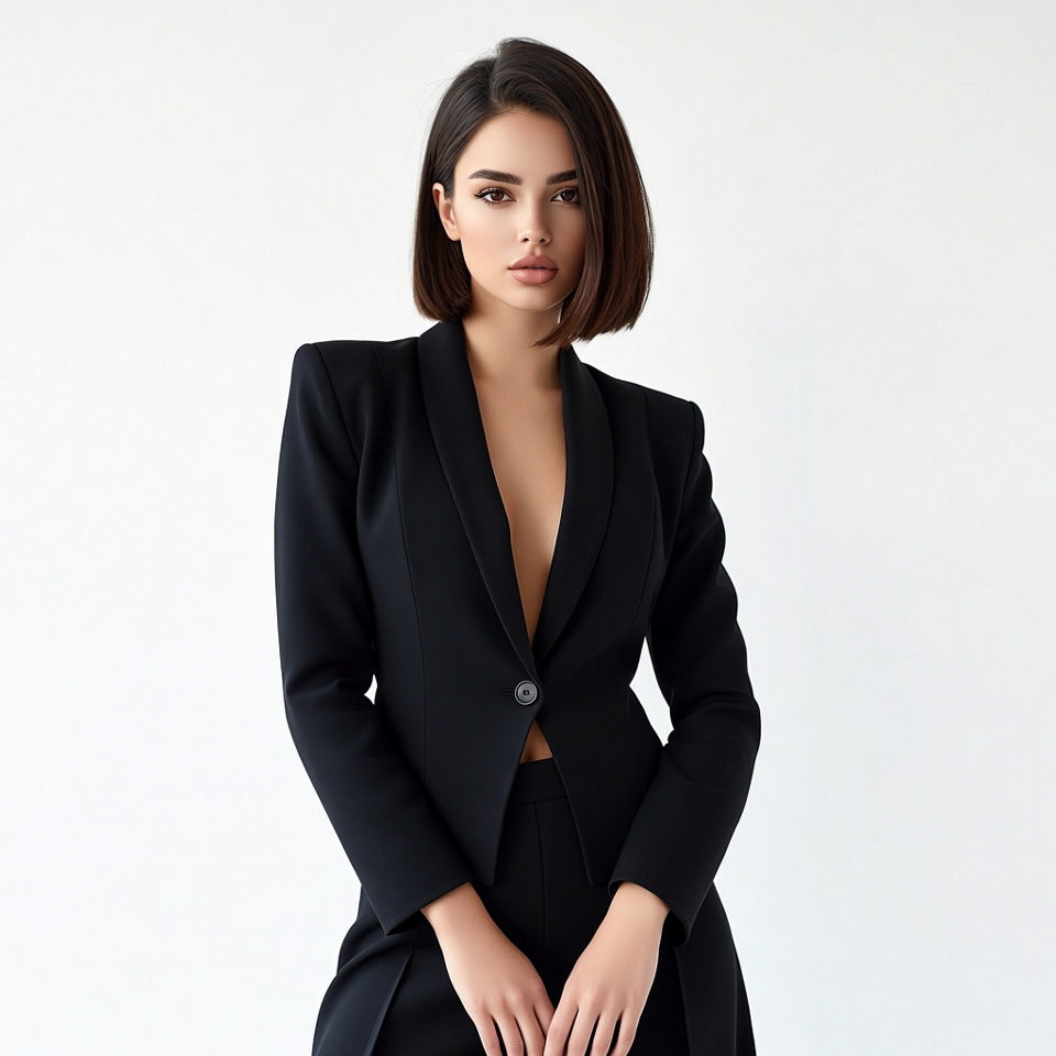 A young woman with shoulder-length dark brown bob haircut stands confidently against a white background. She wears a tailored black blazer with a deep plunging neckline and matching pants. Her hands are clasped in front as she poses elegantly.