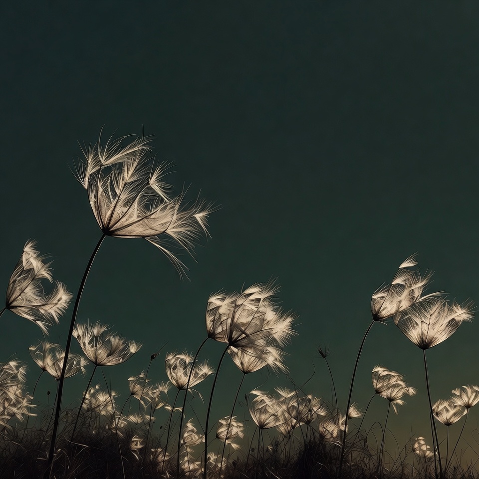 botany, cluster, dark background, ethereal plants, feathery seeds, field, fluffy grass, glowing plants, grass, macro nature, nature, plant closeup, plants, seed heads, seed pods, stems, teal sky, white plumes, wildflowers, fluffy seeds