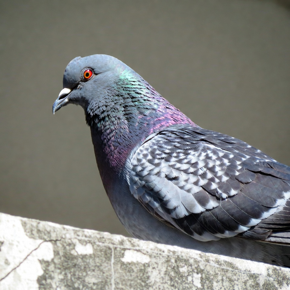 avian, bird, city pigeon, concrete ledge, feathers, gray pigeon, iridescent neck, isolated background, red eye, rock dove, side view, urban bird, white beak, wildlife, pigeon