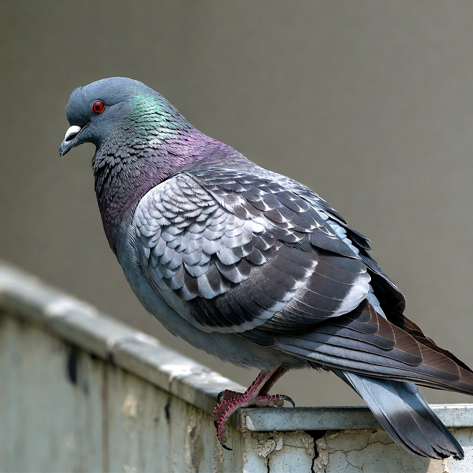 animal, avian, bird, concrete ledge, feathers, gray pigeon, green feathers, iridescent neck, isolated background, ledge, perched, pink feet, purple feathers, red eye, rock pigeon, urban bird, white beak, wildlife, pigeon