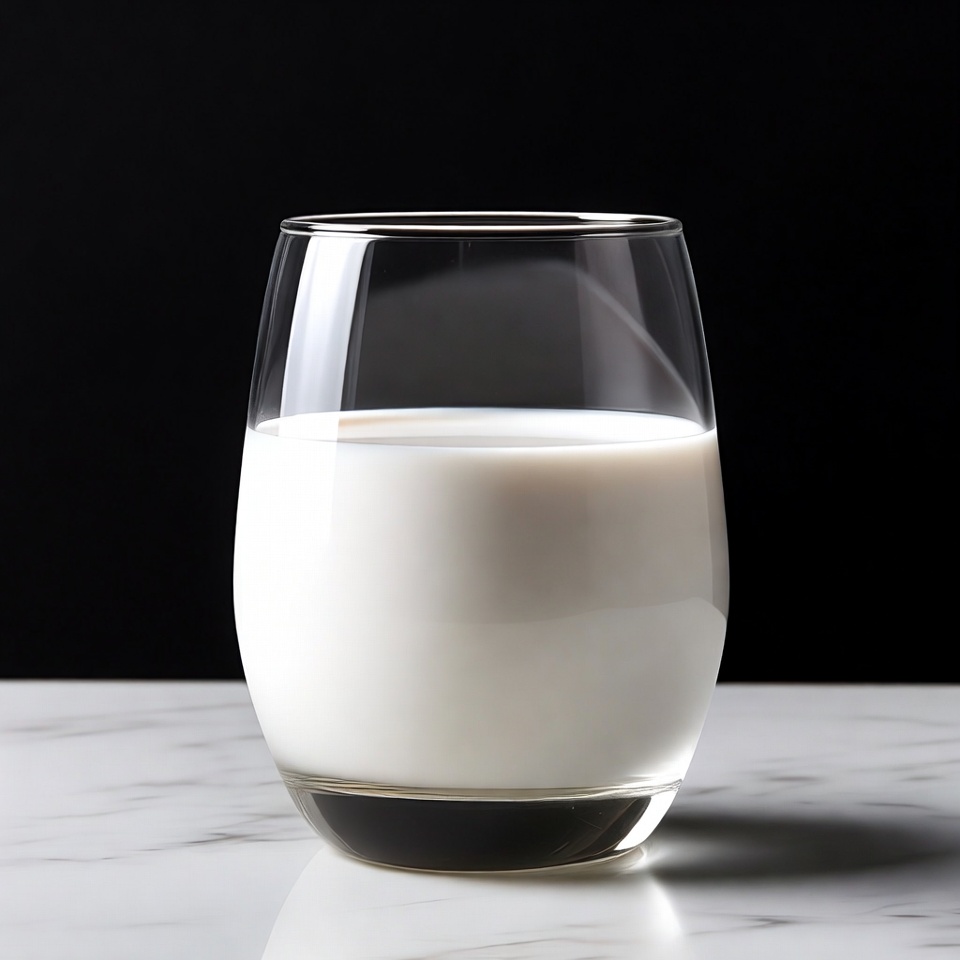 A clear glass tumbler filled with white milk sits on a white marble surface. The glass has a slight curve and reflects light against a black background. Condensation droplets are visible on the glass exterior.