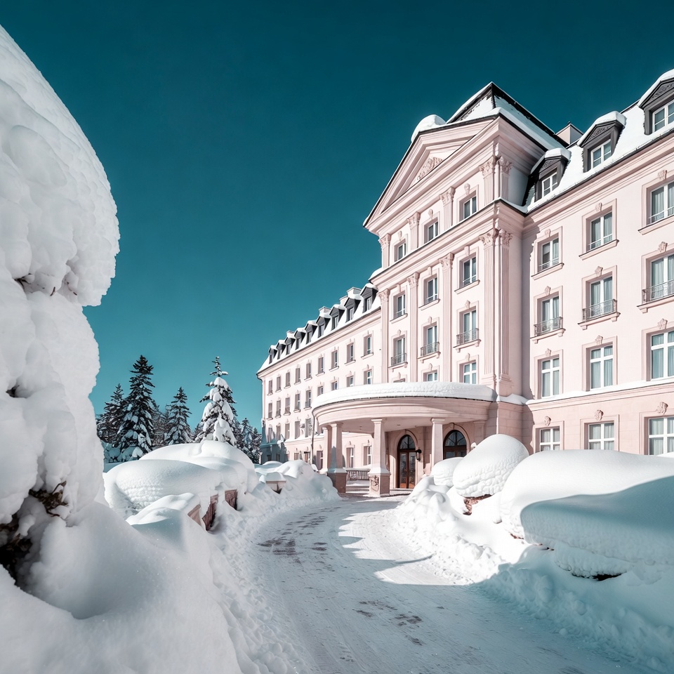 Alps, architecture, blue sky, classical architecture, entrance, evergreens, frozen landscape, grand hotel, heavy snow, luxury hotel, mountains, pathway, pink building, pink facade, portico, ski resort, snow, snow-covered trees, snowy hotel, white snow, winter, hotel