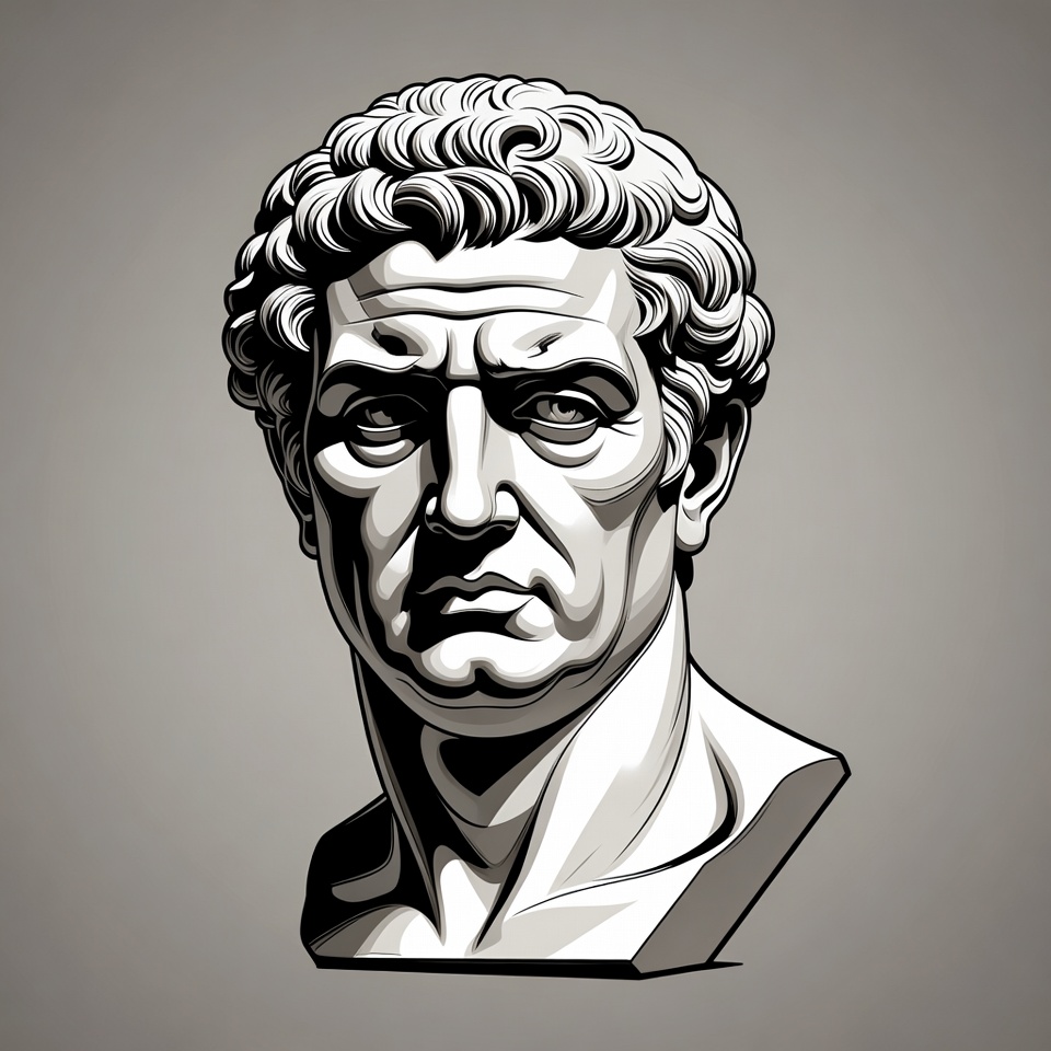 White, ancient Rome, bust, classical art, curly hair, digital drawing, grayscale, head sculpture, historical figure, illustration, intense eyes, isolated background, male, muscular jaw, portrait, sculpture style, stern face, vector art, Roman man