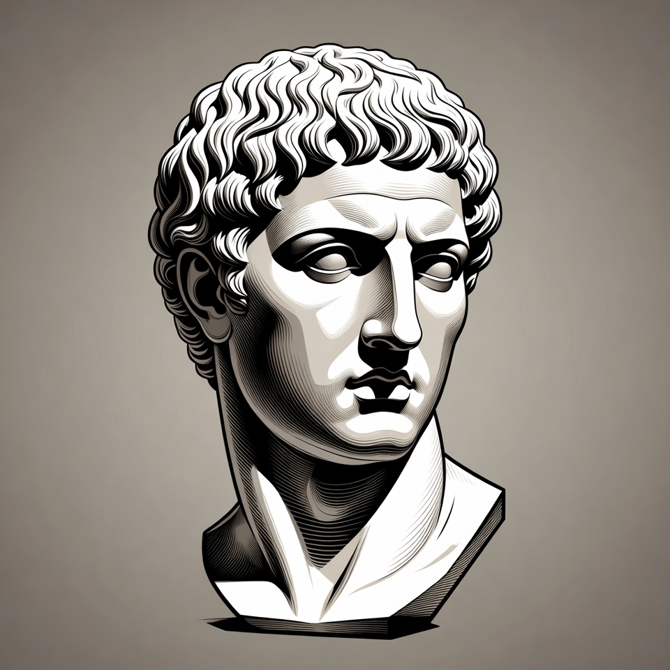White, ancient bust, antiquity, artistic rendering, beardless, chiseled face, classical art, curly hair, emperor portrait, grayscale, head and shoulders, historical figure, illustration, ink drawing, intense eyes, line art, male, marble style, muscular neck, portrait, profile view, sculpture, serious expression, short hair, vector art, Roman man