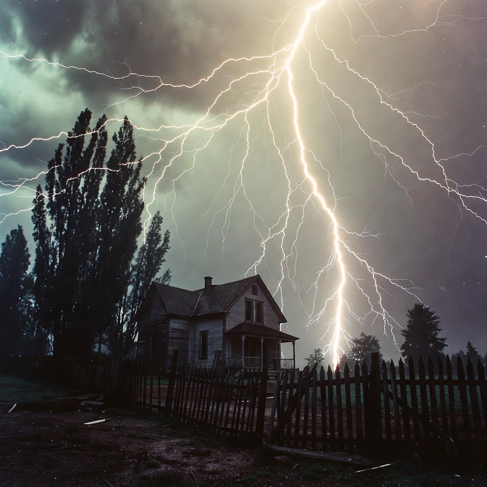 A dramatic lightning bolt strikes near an old wooden house during a stormy night. Tall trees stand beside the house, and a picket fence encloses the yard. Dark clouds fill the sky with intense electrical activity.