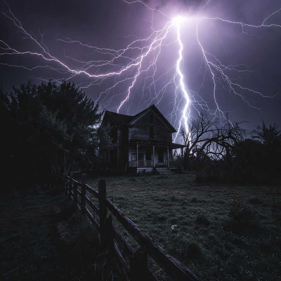 A dramatic lightning bolt strikes near an old, abandoned wooden house at night. The house features a sagging porch and weathered siding, surrounded by dark trees, a dead tree, and a wooden fence in a grassy field. Multiple lightning branches illuminate the stormy sky.