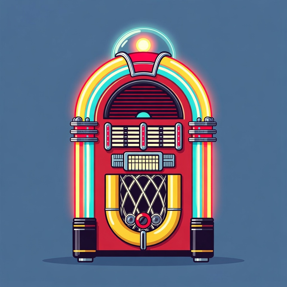 1950s style, chrome accents, clipart, diner jukebox, flat design, glowing lights, illustration, isolated background, music jukebox, neon jukebox, neon lights, rainbow lights, red jukebox, retro jukebox, rock music, vector art, vintage jukebox, jukebox