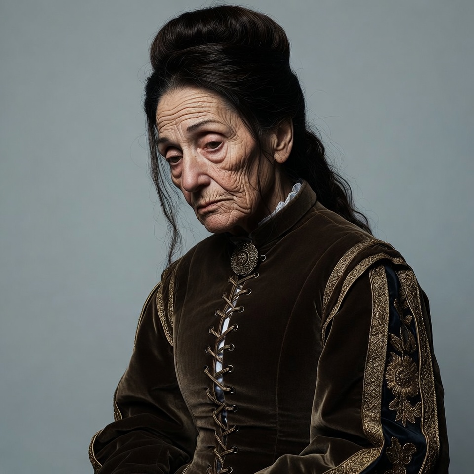 Victorian gown, White, blue accents, brooch, brown velvet dress, dark hair, female, gold embroidery, gray background, lace collar, old woman, somber expression, updo hairstyle, wrinkled face, elderly woman