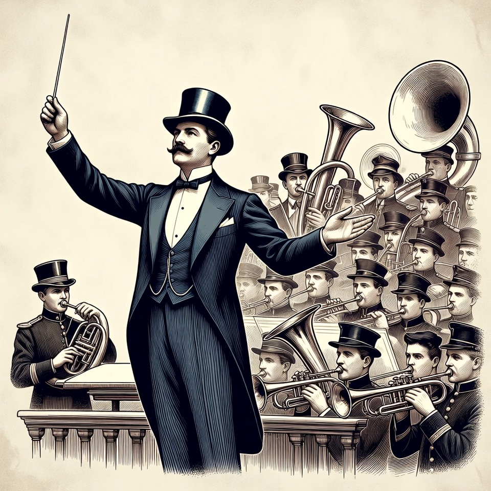 A man in a tuxedo and top hat conducts with a baton in front of a large brass band. The band members, dressed in uniforms with hats, play trumpets, tubas, and french horns. The vintage illustration features a sepia-toned style on a parchment background.