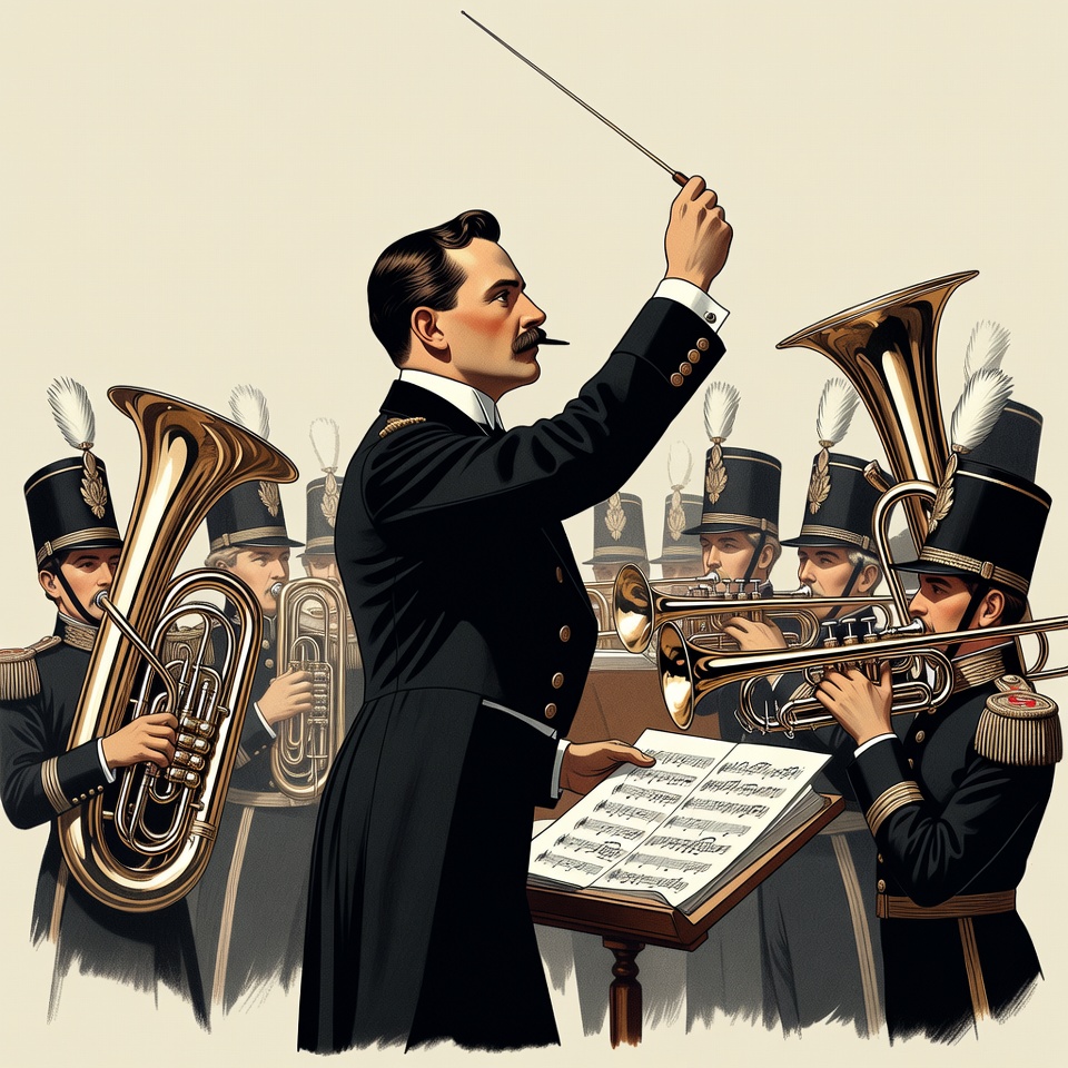 A man in a black tuxedo with a mustache conducts a brass band using a baton. The band members, dressed in dark uniforms with shako hats, play brass instruments including tubas, euphoniums, and cornets. They stand behind a music stand on a plain background in this detailed illustration.