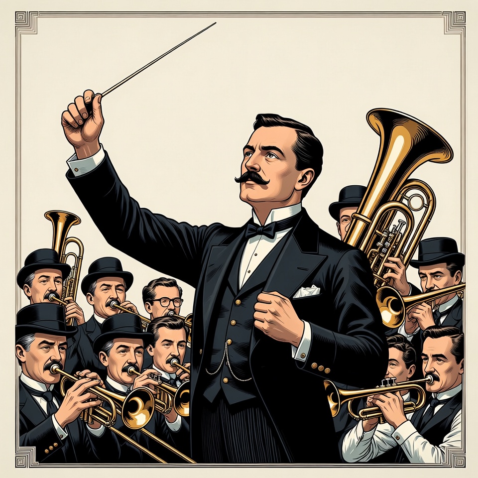 An illustration depicts a male conductor in a black tuxedo and mustache energetically conducting with a baton. He stands before a group of men in tuxedos and top hats playing brass instruments like trombones and tubas. The scene is framed on a white background in a vintage Art Deco style.