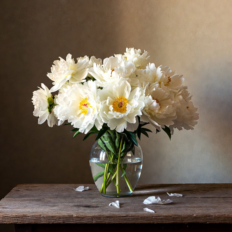 A bouquet of lush white peonies with yellow centers stands in a clear glass vase filled with water. The flowers are arranged on a rustic wooden table with scattered petals nearby. Soft lighting highlights the delicate petals against a neutral background.