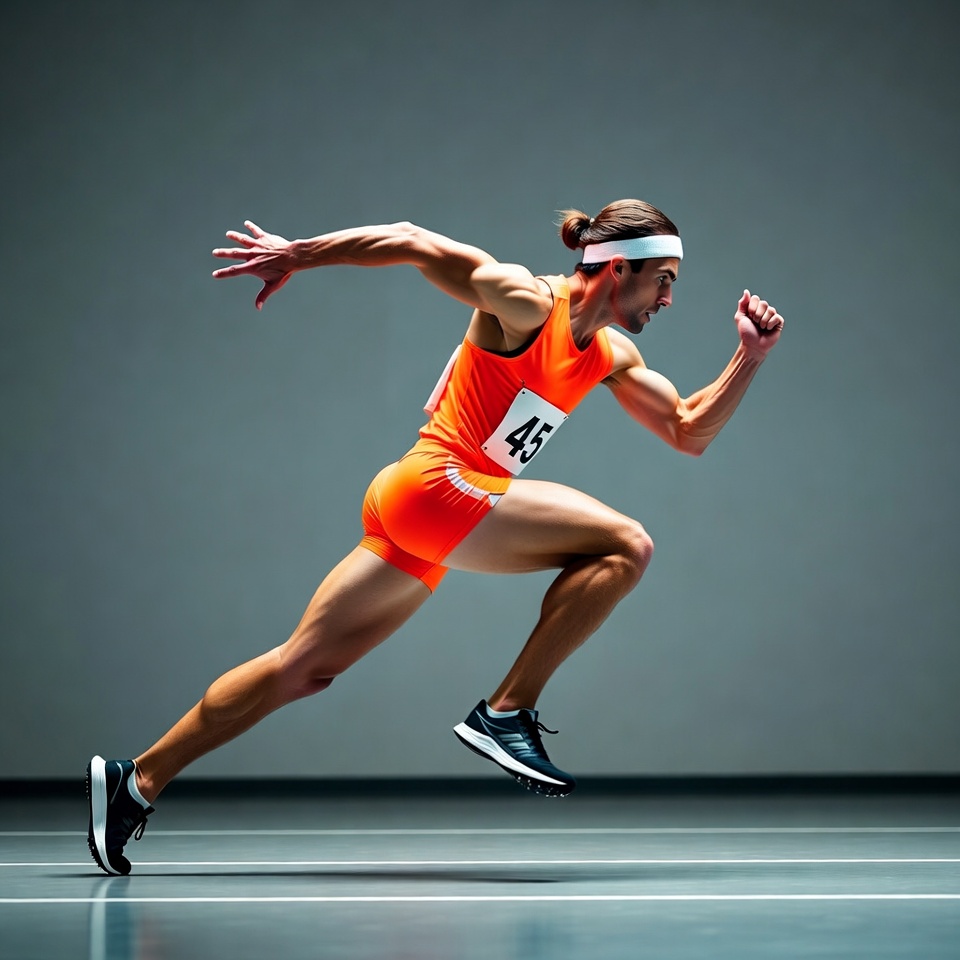 White, arms, athlete, competition, dynamic pose, fitness, gray background, headband, indoor, legs, male, motion, muscular, number 45, orange tracksuit, ponytail, runner, running, running shoes, sports, sprinting, track, man
