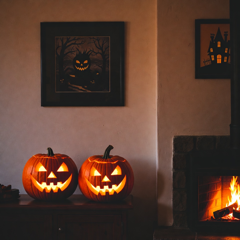 Two carved jack-o-lantern pumpkins with glowing faces sit on a wooden cabinet in a cozy room. A stone fireplace with a warm fire burns nearby, casting an orange glow. Framed Halloween artwork of haunted houses and spooky trees hangs on the walls.