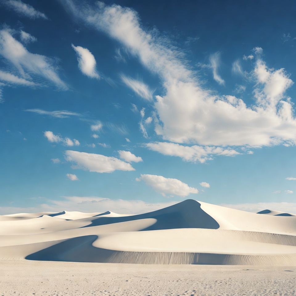 Sahara-like, adventure, arid, blue sky, clouds, curved ridges, desert, dune field, dunes, empty landscape, horizon, landscape, nature, outdoor, peaceful, scenery, serene, shadows, sky, smooth dunes, sunny, travel, vast desert, white clouds, white sand, wilderness, sand dunes