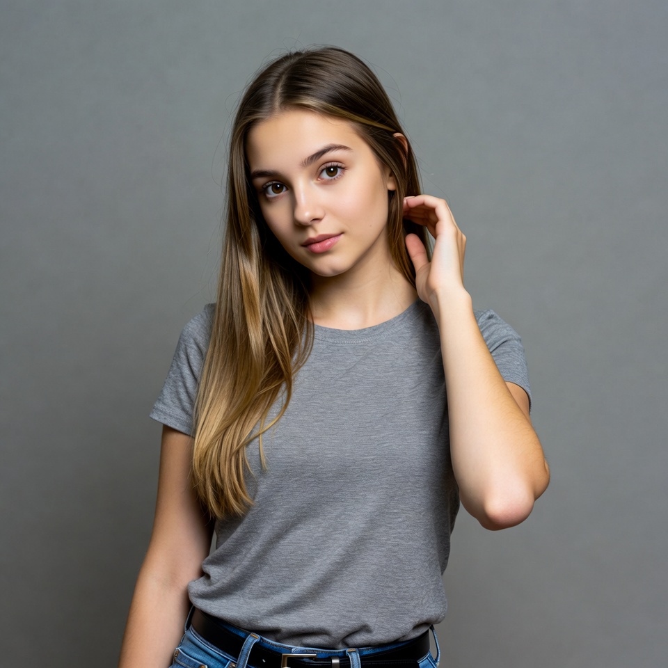 White, blue jeans, brown hair, casual clothing, female, girl, gray background, gray t-shirt, hand on hair, headshot, isolated background, long hair, portrait, short sleeves, straight hair, subtle smile, touching hair, young woman, woman