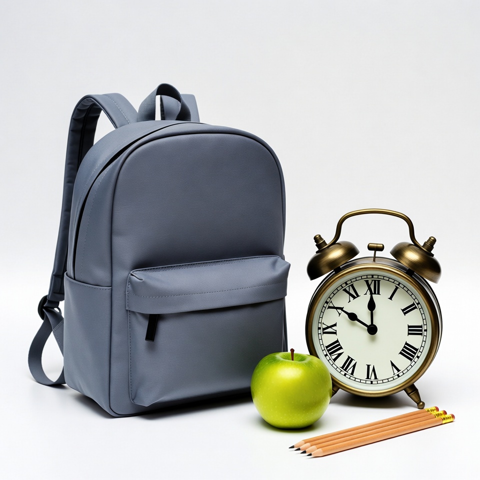 A gray backpack sits on a white background next to a brass alarm clock with Roman numerals. A green apple rests beside the clock, and a bundle of yellow pencils lies nearby. The items are arranged neatly for a school-themed still life.