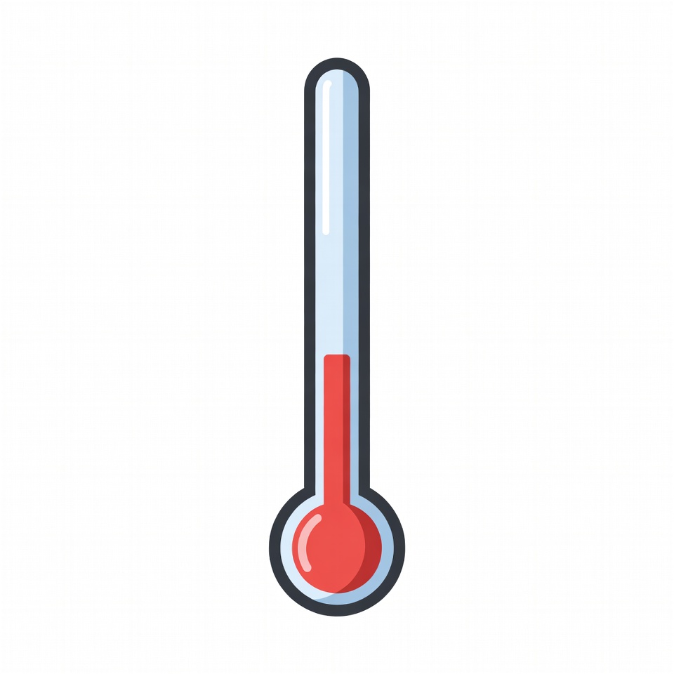 A simple flat illustration of a thermometer with a red bulb at the bottom and a red mercury level rising partway up the tube. The thermometer has a white outline on a transparent background. It features clean lines and minimalistic design typical of vector clipart.