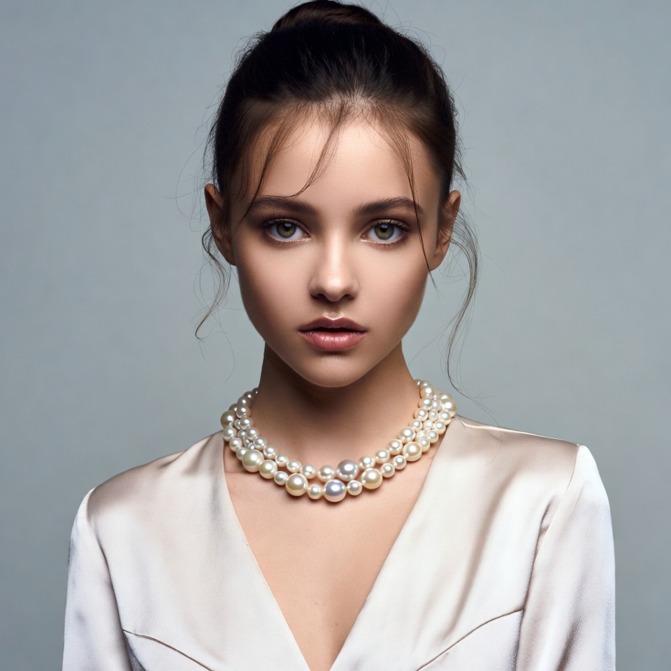 A young woman with dark hair in an updo gazes at the camera against a gray background. She wears a shiny white satin blouse with a deep V-neck and multiple strands of large white pearls around her neck. Her expression is neutral with subtle makeup highlighting her blue-gray eyes and full lips.