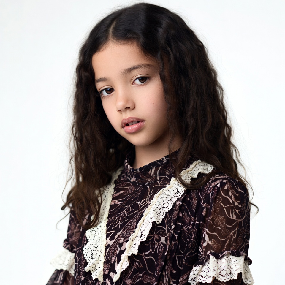 A young girl with long curly dark brown hair stands against a white background. She wears a maroon sheer dress with intricate lace trim on the collar and sleeves. Her expression is neutral with slightly pursed lips.