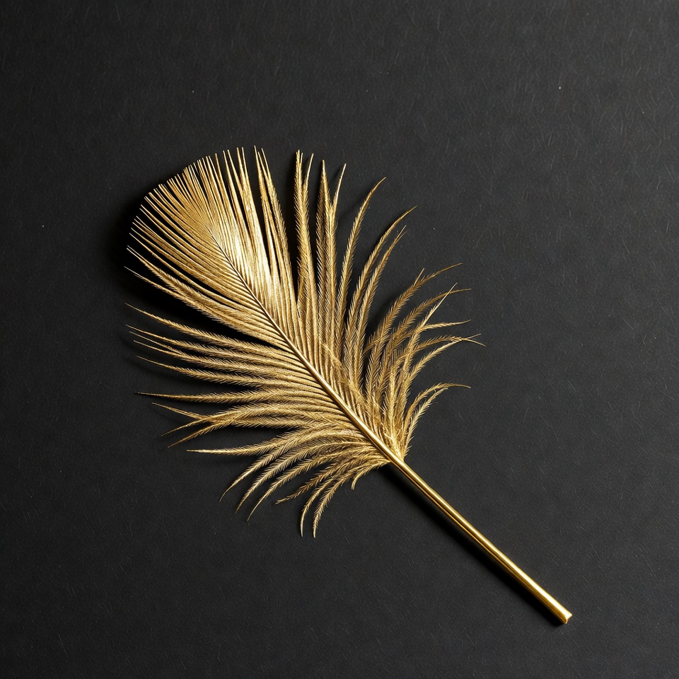 A single golden feather with fine, detailed barbs lies flat on a smooth black surface. The metallic gold color shines subtly against the dark backdrop. It is positioned diagonally with a slender quill at one end.