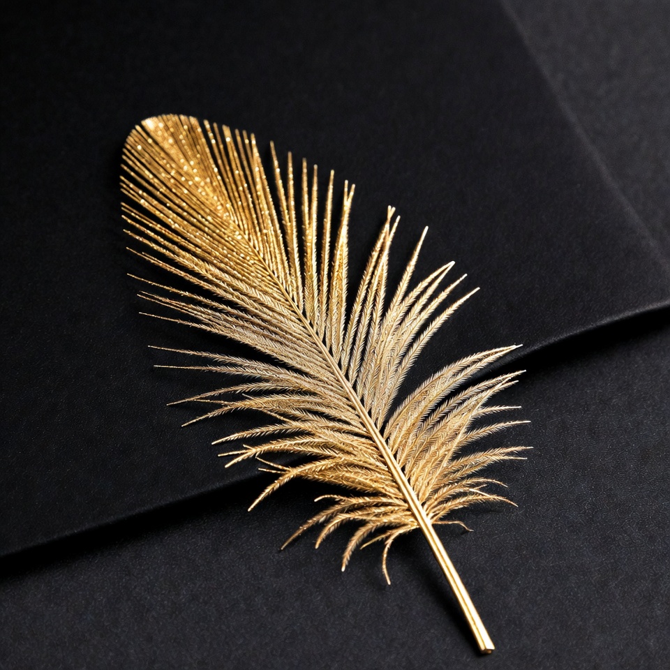 A shiny golden feather with intricate feather-like details lies diagonally across a black envelope. The feather features a metallic gold finish with subtle shimmering highlights. It rests on a smooth, dark background, emphasizing its luxurious texture.