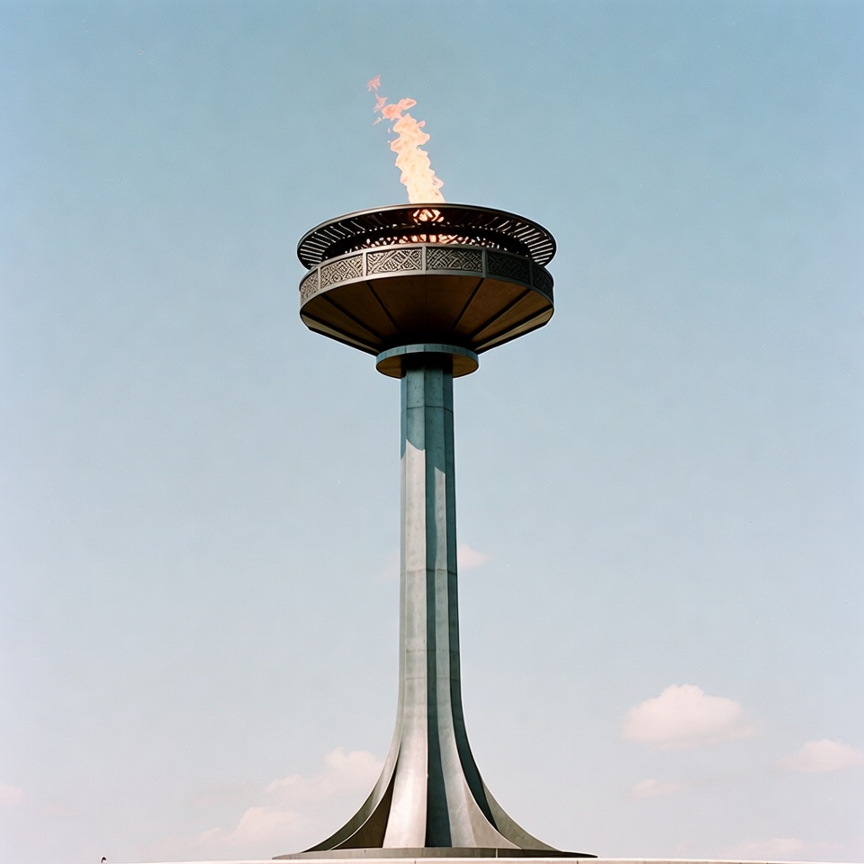 Olympics, blue sky, burning flame, clouds, eternal flame, fire, flame, isolated background, landmark, metal structure, monument, sports symbol, tall pedestal, torch, Olympic torch