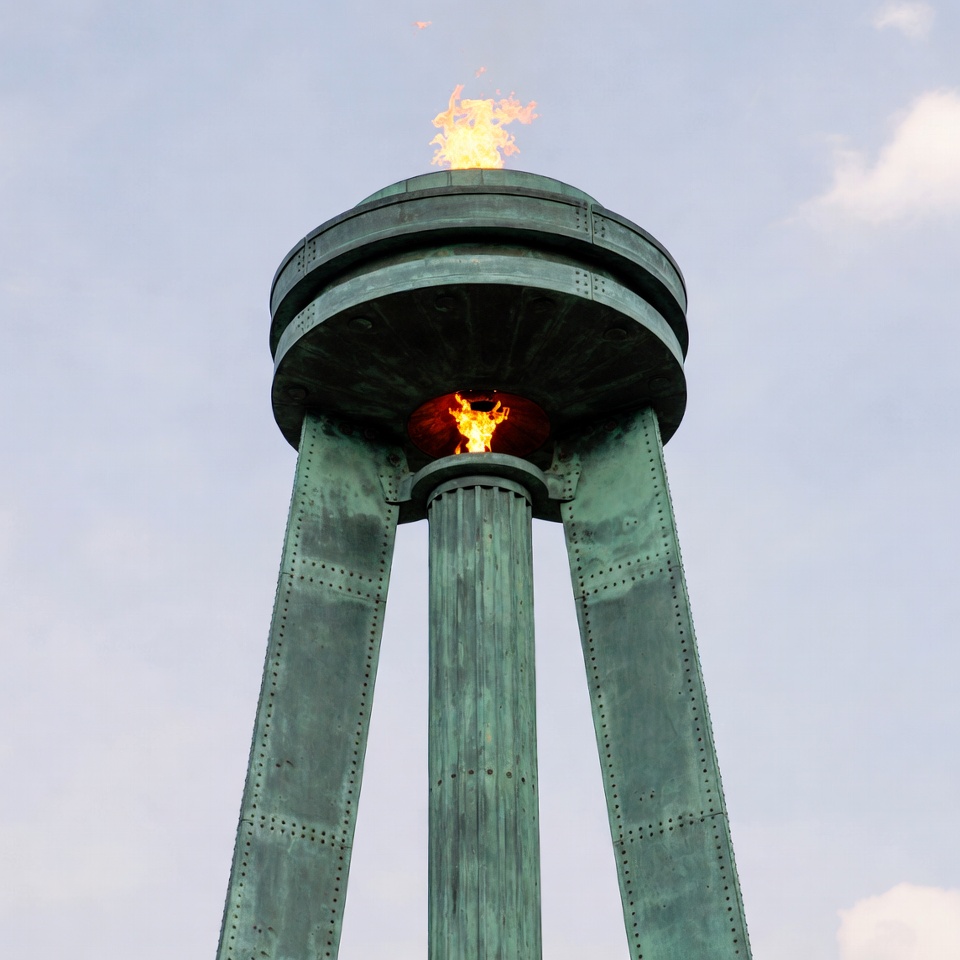 Olympics, bronze torch, burning torch, cloudy sky, eternal flame, fire, flame, lit torch, metal structure, orange flame, outdoor torch, sky background, sports symbol, stadium torch, three legs, torch flame, victory symbol, Olympic torch