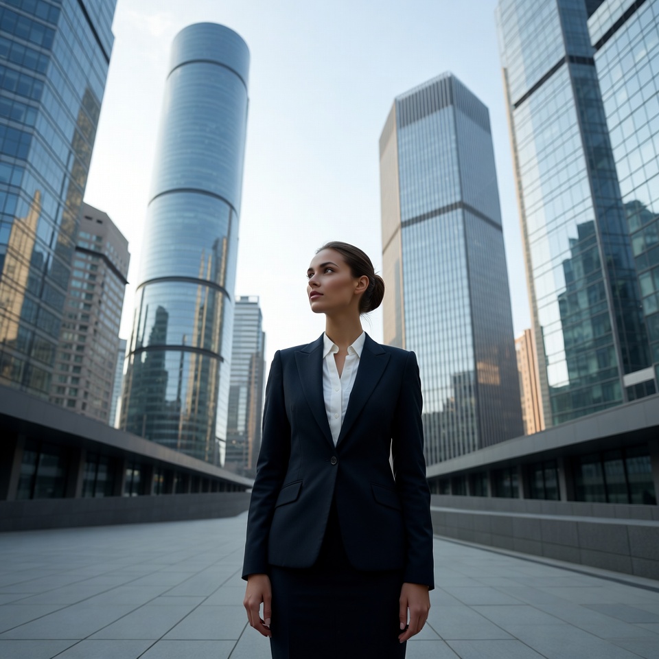 A woman with her brown hair in a bun stands confidently on a wide outdoor platform surrounded by tall modern skyscrapers. She wears a tailored black suit jacket, white collared blouse, and matching skirt. She looks upward with a determined expression amid the urban architecture.
