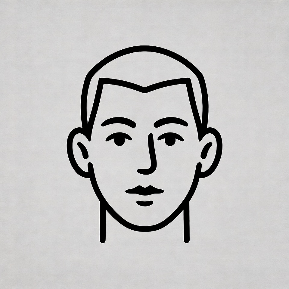 A simple black line drawing of a man's face with short hair, visible ears, and a neutral expression. The illustration features clean outlines on a light gray background. It is a minimalist vector-style portrait.