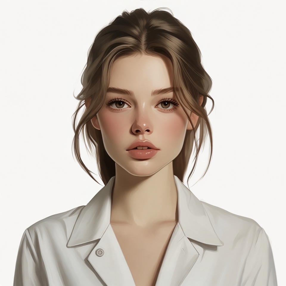 White, attractive, beautiful, brown hair, closeup, collared shirt, digital art, face, female, feminine, glossy lips, headshot, illustration, pink blush, ponytail, portrait, realistic style, soft makeup, white blouse, young woman, woman