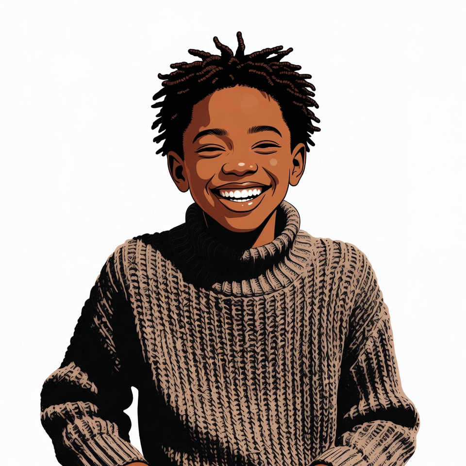 A cartoon illustration of a young African-American boy with curly afro hair smiles broadly on a white background. He wears a brown knit turtleneck sweater with long sleeves. His face features wide eyes and a cheerful expression.