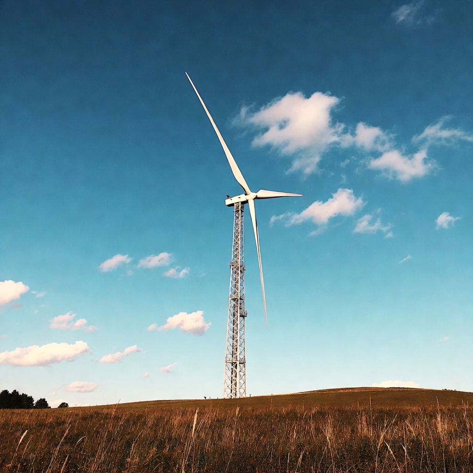 blue sky, clean energy, clouds, electricity, environment, field, grass, grassy hill, horizon, landscape, nature, outdoors, renewable energy, sky, tall tower, three blades, turbine, white clouds, wind power, wind turbine