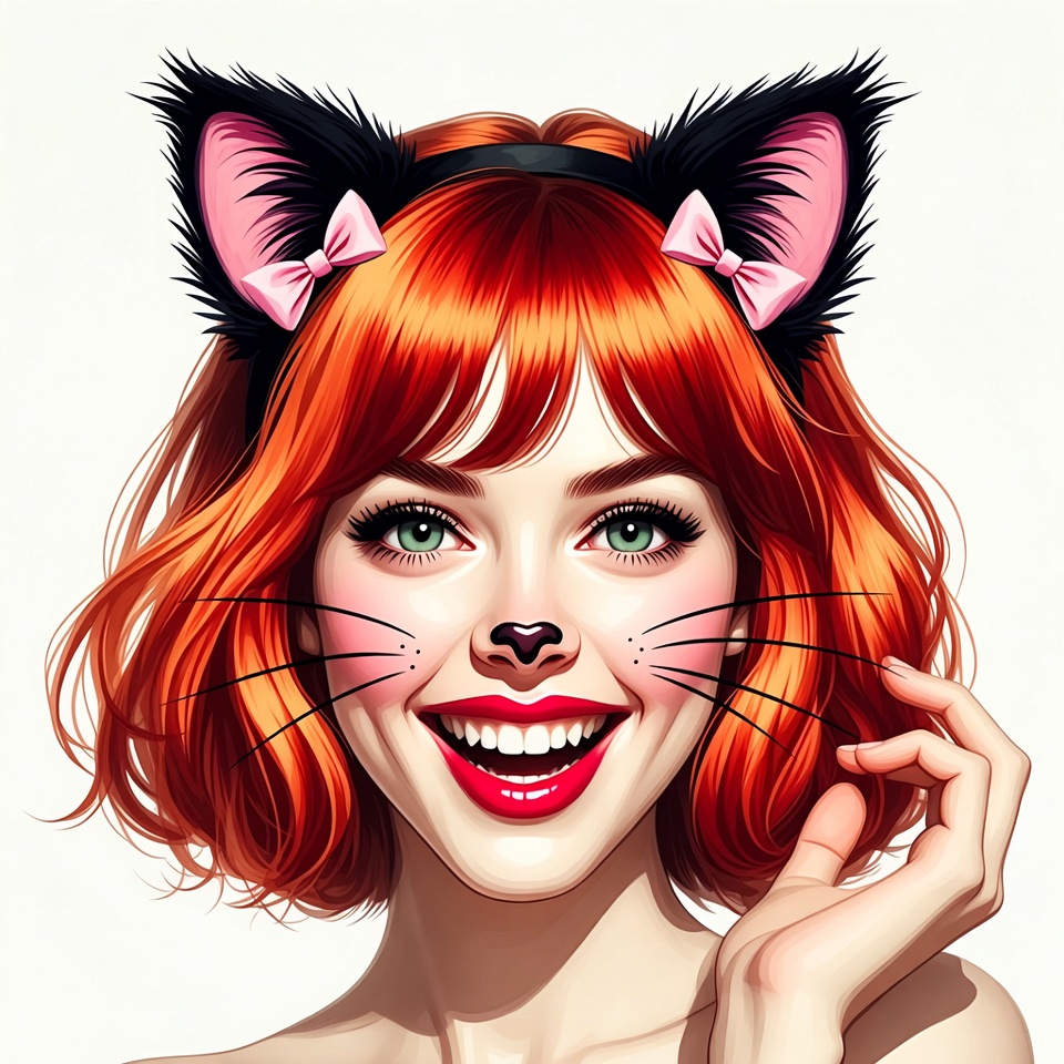 A young woman with vibrant red wavy hair wears a black cat ears headband adorned with pink bows. She has green eyes, black cat nose and whiskers painted on her face, and a wide smile with red lips. Her portrait is set against a white background.