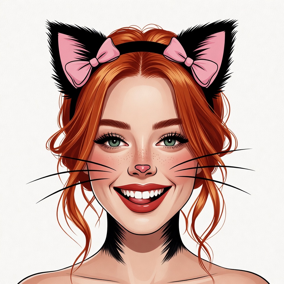 A digital illustration of a smiling young woman with long red hair styled in loose waves. She wears large black cat ears with pink bows on a headband and has drawn pink cat whiskers and nose on her face. Her green eyes sparkle with freckles across her cheeks against an isolated white background.