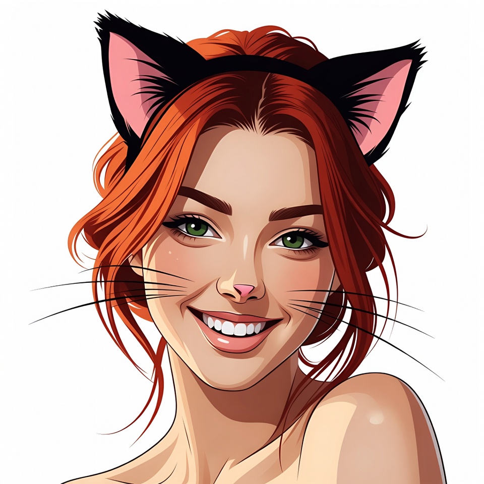 A digital illustration of a smiling young woman with long wavy red hair and green eyes. She wears black cat ears headband with whiskers drawn on her face. The image is on a white isolated background.
