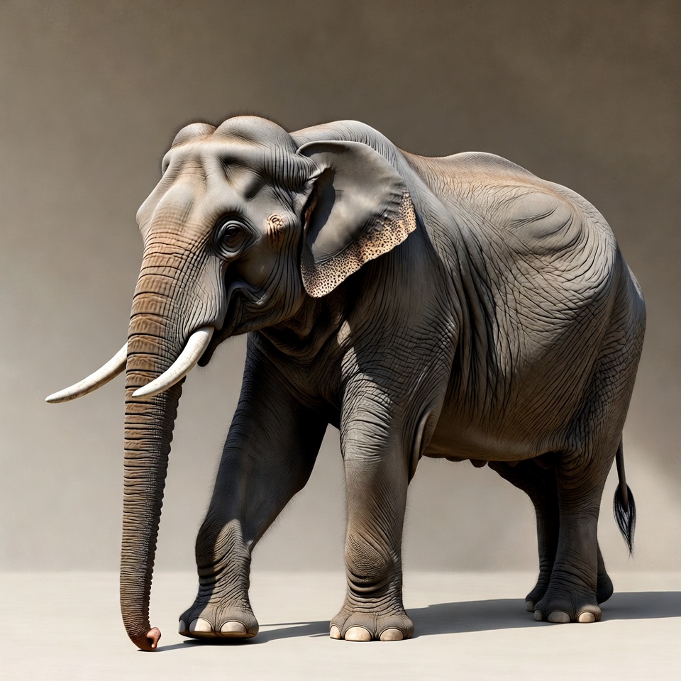 A large gray elephant stands on a light beige background. It has long curved tusks, large flapping ears, and a long trunk curved downward. The elephant's skin shows detailed wrinkles and folds.